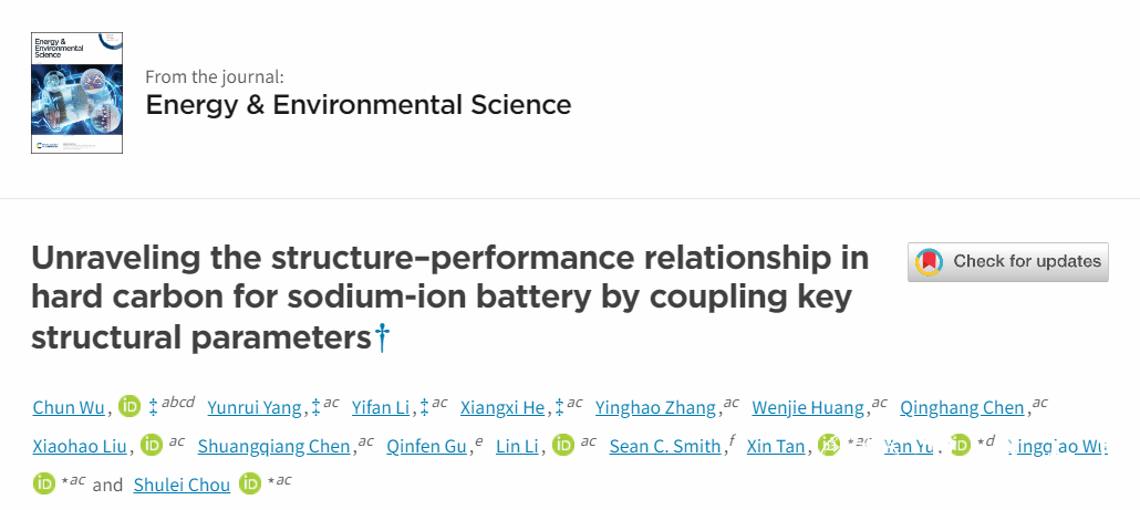 此项工作以Unraveling Structure-performance Relationship in Hard Carbon for Sodium-ion Battery by Coupling Key Structural Parameters为题发表在国际著名期刊Energy & Environmental Science上,beat365正版唯一官网必一作为第一单位,侴术雷教授,谭歆教授,余彦教授,吴星樵老师为通讯作者。该研究工作由博士后吴春、2024届硕士毕业生杨云锐、2023级硕士研究生黎一凡、上海大学/beat365正版唯一官网必一联培博士何祥喜完成。研究工作得到了国家自然科学基金,中国高端外国专家招聘计划,国家重点浙江省自然科学基金中国研发计划项目,安徽省科技计划项目,重点浙江省研发计划项目,温州自然科学基金等资助。