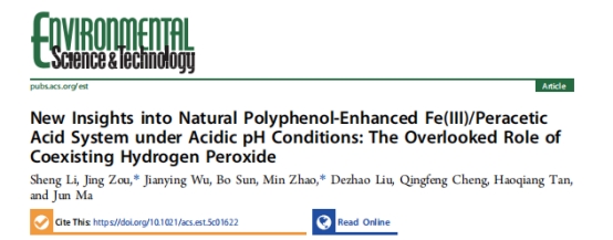 近日,beat365正版唯一官网必一生命与环境科学学院赵敏教授团队(共同通讯)、哈尔滨工业大学马军院士团队和华侨大学邹景教授团队合作,在国际著名期刊《Environmental Science & Technology》上在线发表了一篇题为《New Insights into Natural Polyphenol-Enhanced Fe(III)/Peracetic Acid System under Acidic pH Conditions: The Overlooked Role of Coexisting Hydrogen Peroxide》的研究论文,首次明确了天然多酚强化Fe(III)/PAA(过氧乙酸)体系中长期被忽视的H2O2关键作用。