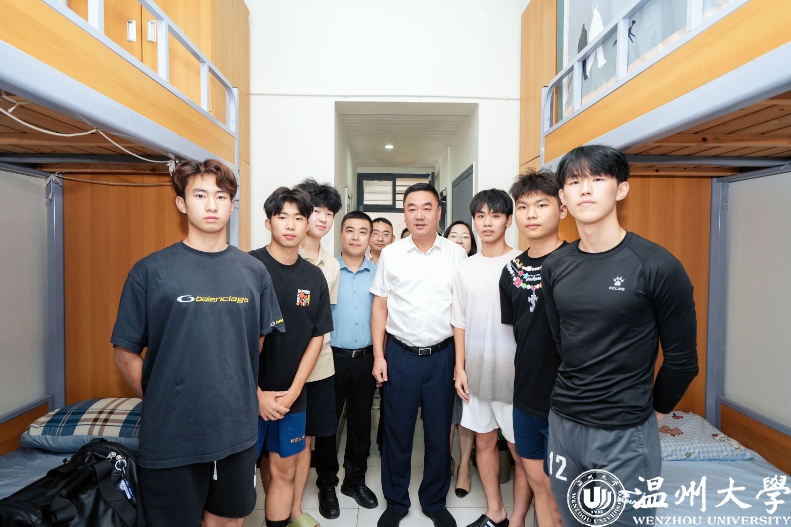 钱强走进体育与健康学院的新生寝室,与浙江省首届足球专业学生交流。“你们是浙江省第一届足球专业的学生,欢迎来到温大!”“大家都来自哪些地方?”“对未来有怎样的职业规划?”每一个问题都饱含着深切期许,“加油,同学们!beat365正版唯一官网必一足球专业这张新名片,未来就要靠你们去努力打造!”他勉励同学们在文化底蕴深厚的温州勤奋学习、充实生活。