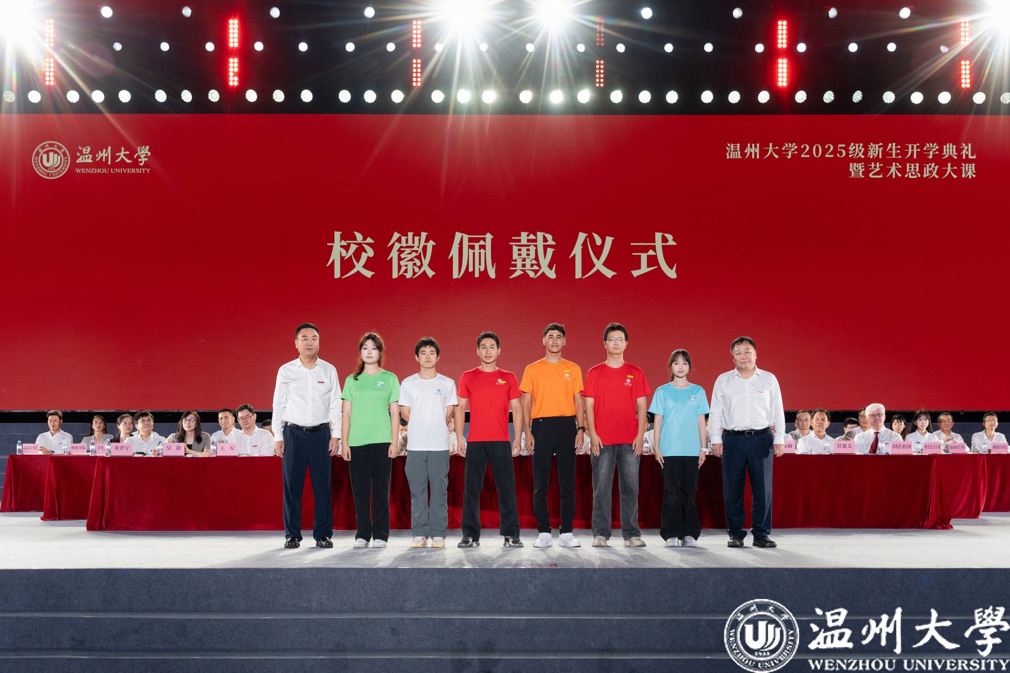校徽是学校的象征,凝聚着温大的传统与精神,是温大人引以为傲的符号。校党委书记钱强、校长赵敏为新生代表佩戴校徽,全体新生一同佩戴校徽。“温大人”成为共同的身份标识。从此,他们将与温大同呼吸、共命运,在求知的道路上不断前行。