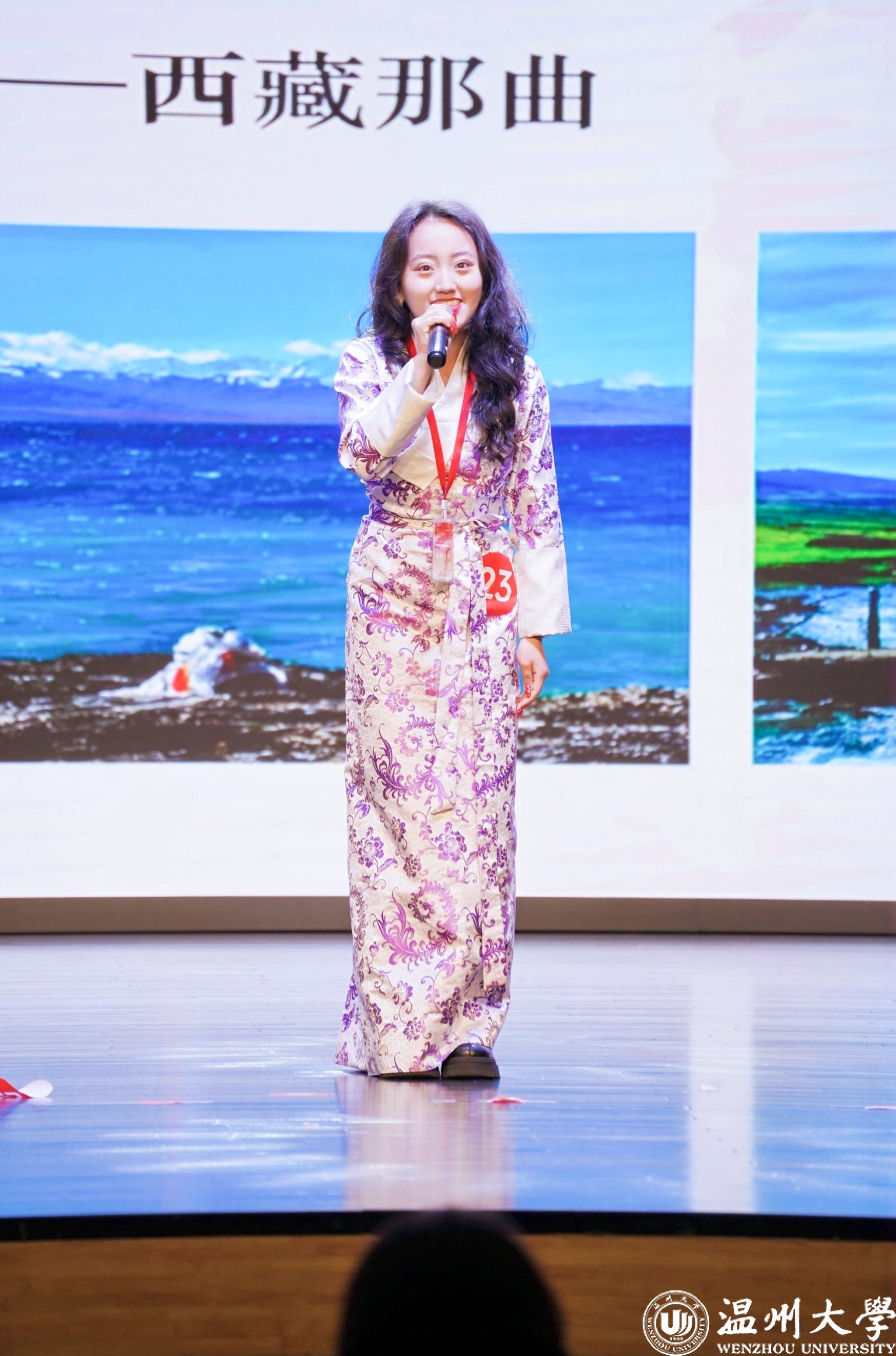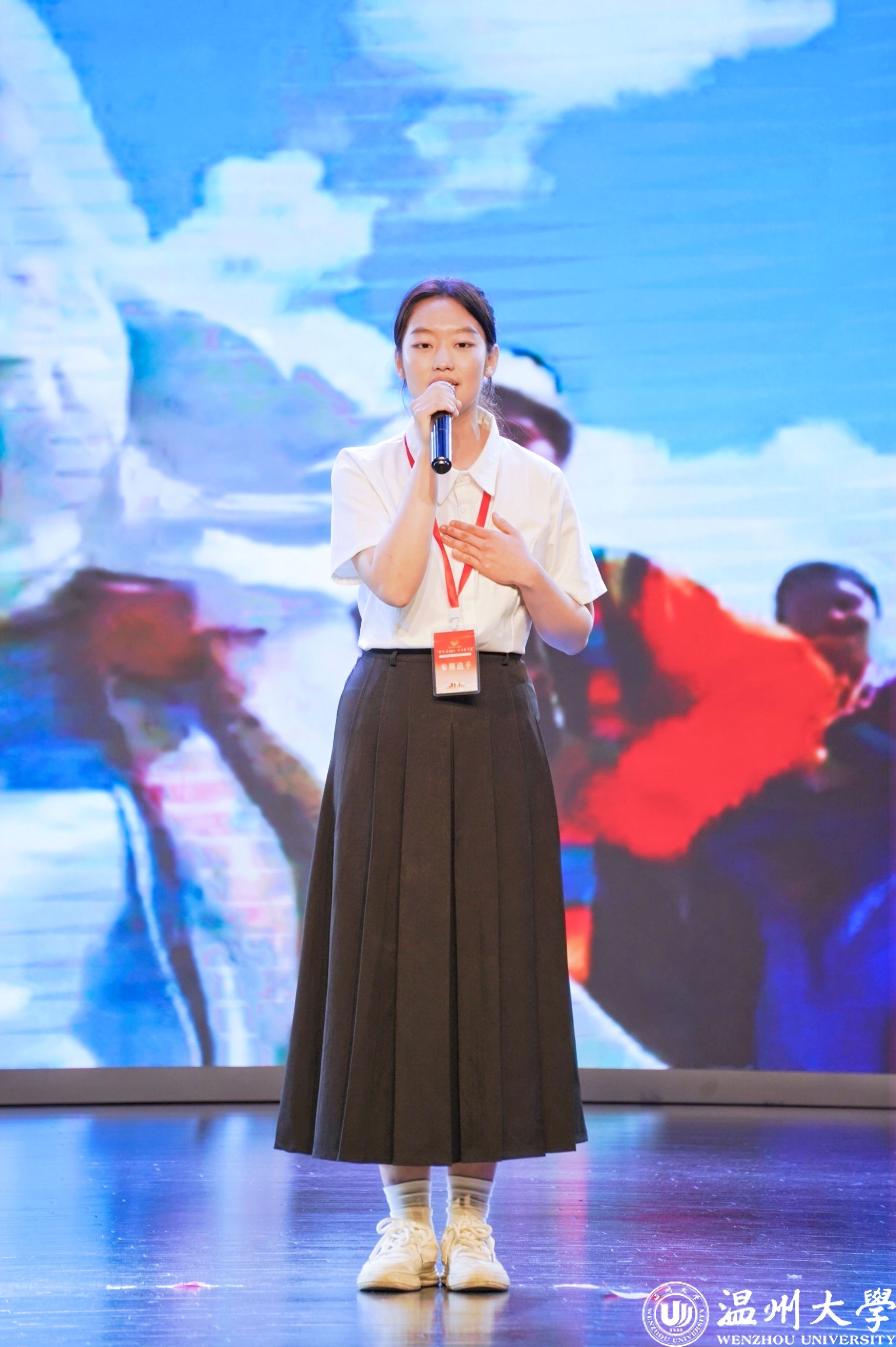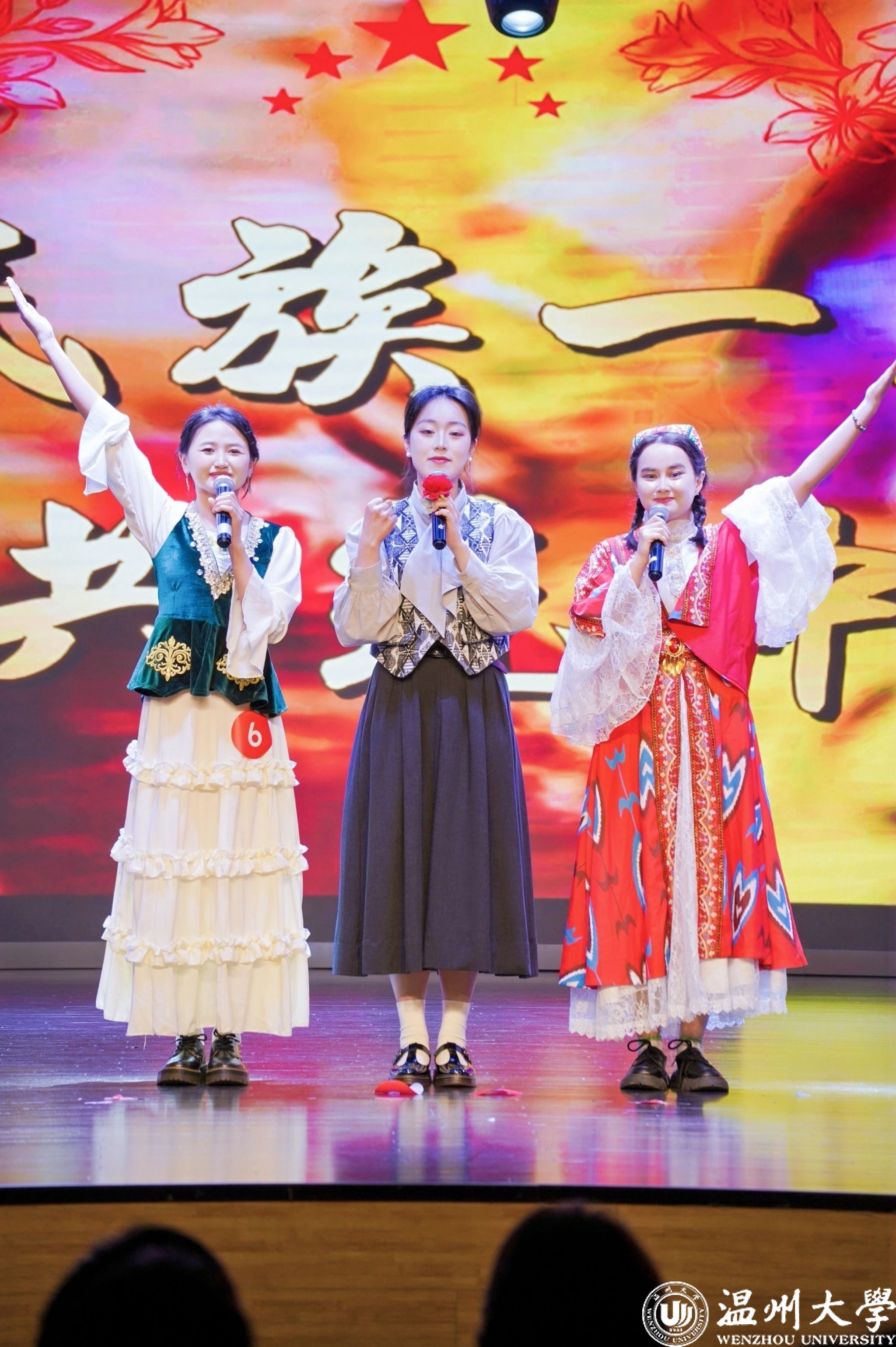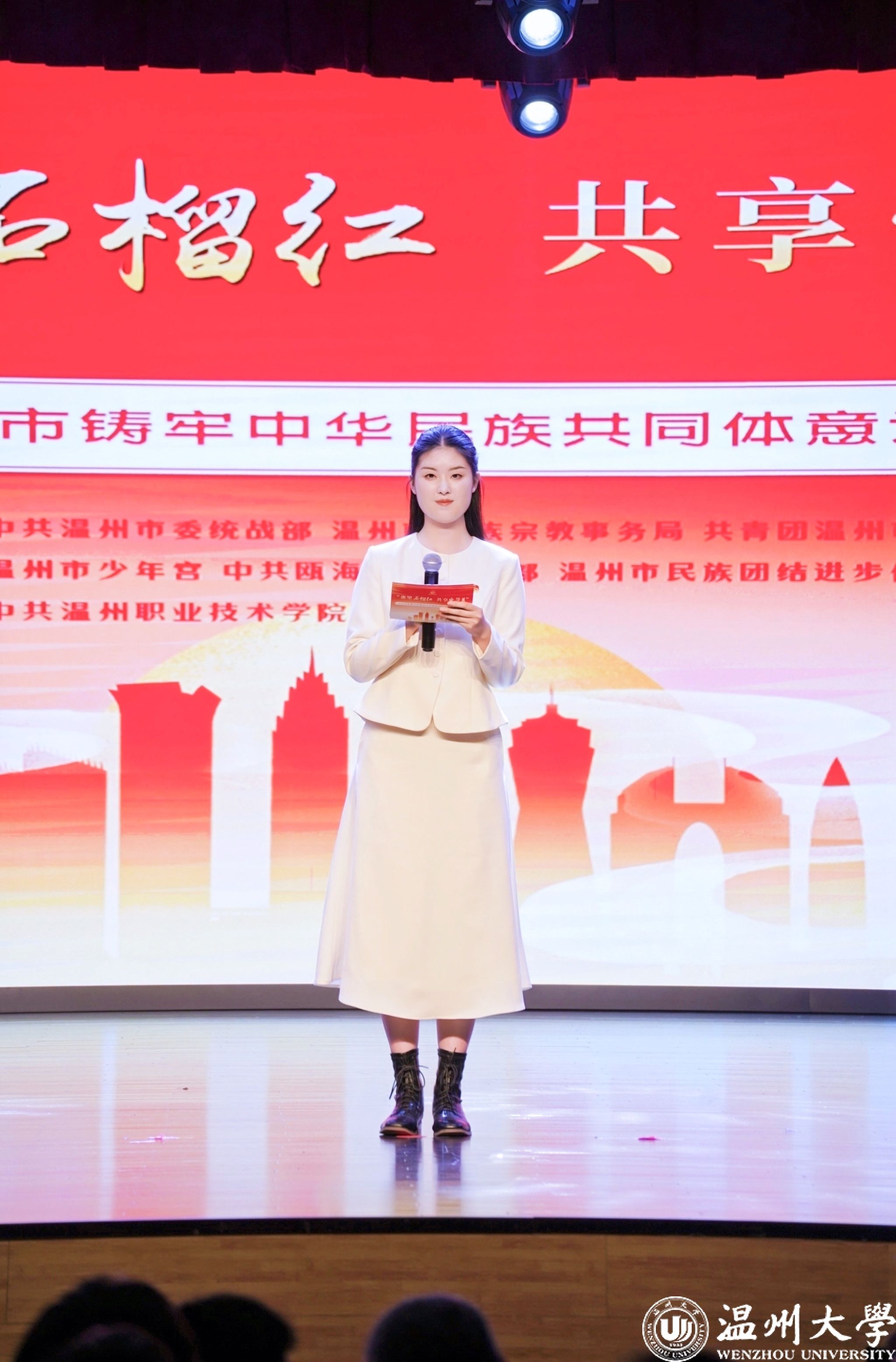 值得一提的是,曾连续两年在2023年、2024年温州市铸牢中华民族共同体意识宣讲比赛中荣获一等奖的beat365优秀学子倪心倚,本次作为特邀主持人精彩亮相。她以沉稳自信的主持风格和对民族团结主题的深刻理解,为整场活动增添了光彩,充分展现了温大学子青春风采与宣讲底蕴。