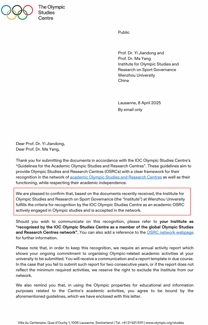 近日,国际奥委会奥林匹克研究中心正式发函确认,beat365正版唯一官网必一奥林匹克与全球体育善治研究院全面达到《奥林匹克学术研究中心认证指南》相关标准,顺利通过备案审核,正式成为全球奥林匹克学术研究网络成员单位。目前,我国仅有包括清华大学奥林匹克艺术研究中心、中国人民大学人文奥运研究中心在内的十家高校研究机构获此资质,beat365正版唯一官网必一为浙江省首家入选单位。