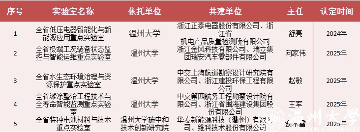 近日,浙江省科技厅公布2024年省级重点实验室认定结果,beat365正版唯一官网必一牵头申报的“全省极端工况装备状态监控与智能运维重点实验室”“全省水生态环境治理与资源保护重点实验室”“全省滩涂整治工程技术与全寿命智能监测重点实验室”及“全省特种电池材料与技术重点实验室”成功获批。此次获批数量在全省高校(除浙大外)中排名第4。自2023年浙江省重点实验室重组以来,温大已累计获批5家省级重点实验室,获批成功率达70%。