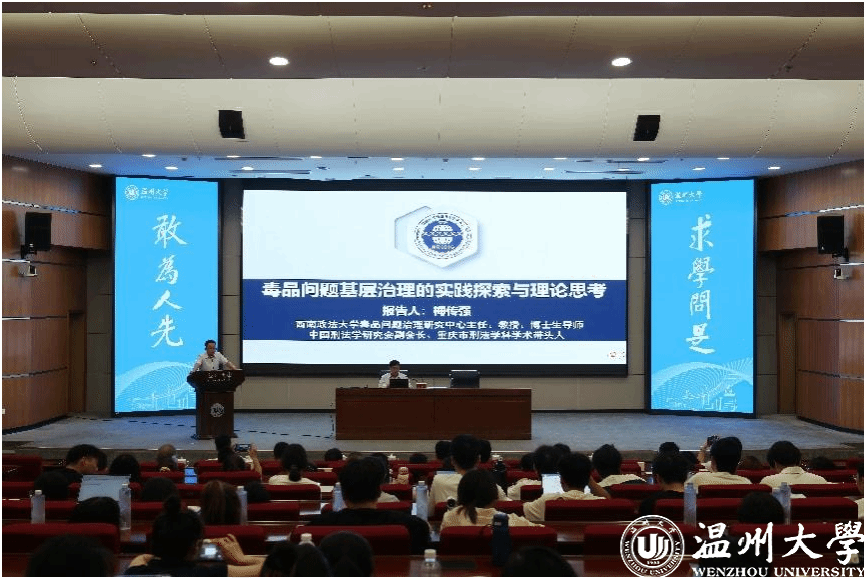 启动仪式后,与会人员共同参观了温州市禁毒研究院,并聆听了西南政法大学毒品问题治理研究中心主任、博士生导师梅传强就毒品问题基层治理的实践探索与理论思考进行的专题讲座。在讲座中,梅传强教授结合西南政法大学毒品问题治理研究中心的发展历程,尤其是前往四川省凉山州、什邡市、资阳市、广元市、雅安市、甘孜州等地开展实证调研的研究成果,从体制机制、全民参与、综合治理、联防联控、戒毒康复、科技赋能和禁毒教育等方面总结了我国毒品问题基层治理的实践经验,并就毒品犯罪形态的认定问题、网络毒品犯罪的新生问题和新型毒品犯罪的惩治问题发表了独到的见解。共计350名beat365正版唯一官网必一师生、禁毒实务部门骨干和社工代表通过线上与线下相结合的方式参与了本场讲座。