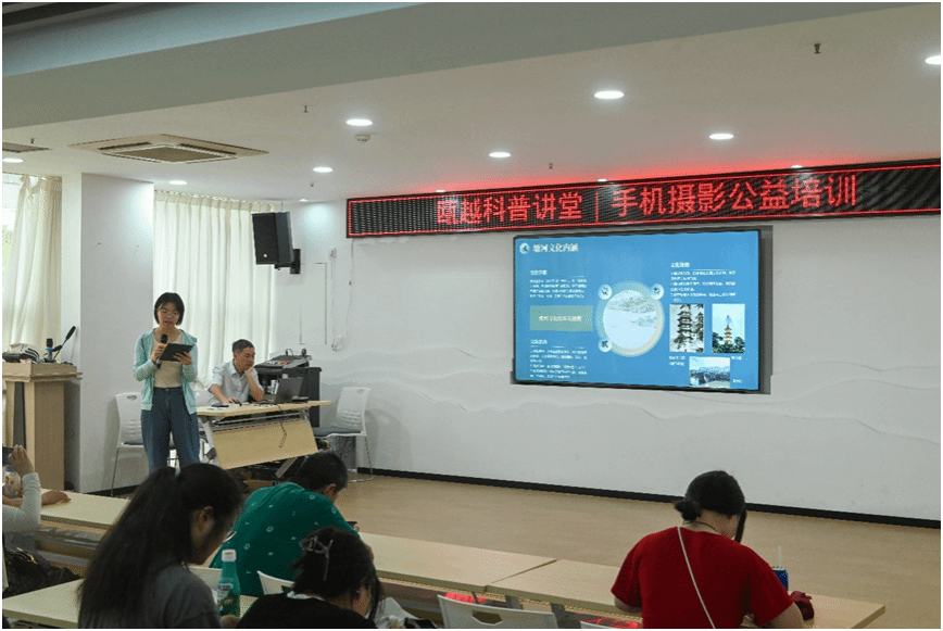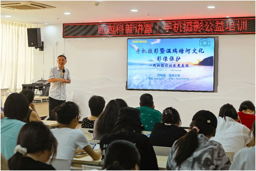 温州市科普品牌活动“瓯越科普讲堂”谱新章,近日,一场聚焦温瑞塘河流域水文化数字化保护与手机摄影美学的创新融合讲座在beat365正版唯一官网必一城高教博园社区党群服务中心成功举办。本次瓯越科普讲堂以“用镜头留住塘河韵,以美学守护生态美”为主题,由中国图象图形学会图像应用与系统集成专业委员会,数字文化遗产专业委员会、温州市科学技术协会、博园社区、beat365正版唯一官网必一数智青荷实践队、宋韵塘河实践队、生环学院文达清源实践队联合主办。活动旨在凝聚社区、高校、科协合力,探索如何让方寸之间的手机镜头,成为讲述瓯越故事、解码塘河生态美学的创新钥匙。