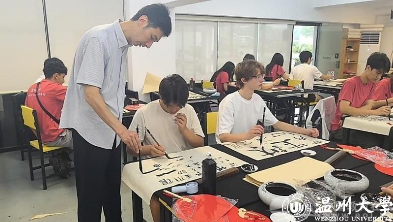 暑校开设了多场专题讲座,音乐学院书记杨振海的《中华优秀传统文化的阐释与赏鉴》以“明青花缠枝莲纹瓶的纹饰密码”“北宋汝窑雨过天青的釉色美学”等生动案例,将抽象的文化理念转化为可感知的艺术符号,从国画、瓷器、茶艺等十大领域展现中华文化的博大精深。美术与设计学院书记刘青松则在胤秀文化温州影视基地通过摄影艺术中“留白如诗”的构图原则和“阴阳相济”的光影运用,带领营员感悟摄影中“天人合一”的东方美学理念。中国书法课堂上,高玥老师从王羲之《兰亭集序》的飘逸到颜真卿楷书的雄浑,现场示范“气韵生动”的笔墨技法。水墨画课程中,梁腾老师一步步拆解画竹的“中锋行笔”与“分组勾勒”,让营员在淡墨浓彩间体会“书画同源”的深意。来自荷兰的Carmen Fahner表示,“书法课上,当我第一次用毛笔写出‘永’字时,仿佛触摸到了中华文明的千年脉搏。”