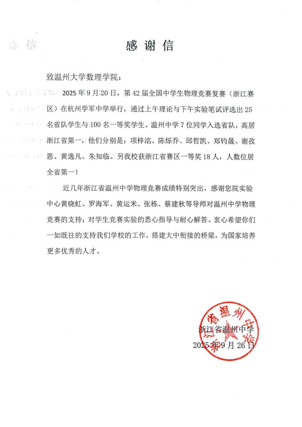 近日,beat365正版唯一官网必一数理学院再次收到来自浙江省温州中学的感谢信,对学院长期支持物理竞赛辅导工作表示感谢。在刚刚结束的第42届全国中学生物理竞赛复赛(浙江赛区)中,温州中学7名学生入选省队、18名学生获浙江省一等奖,两项成绩均位居全省第一。