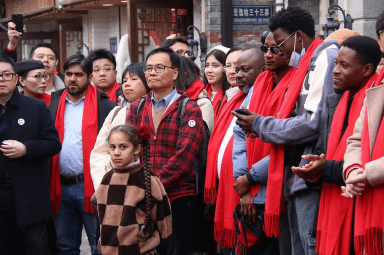 25日,温大留学生赴鹿城五马街参加了“让世界看见‘千年斗城’”活动。活动通过英文导游讲解五马历史文化街区、俄罗斯友人古筝独奏、书法家现场书写春联与“福”字和捣年糕等互动环节,让学生深入了解了温州古城的历史文化底蕴。