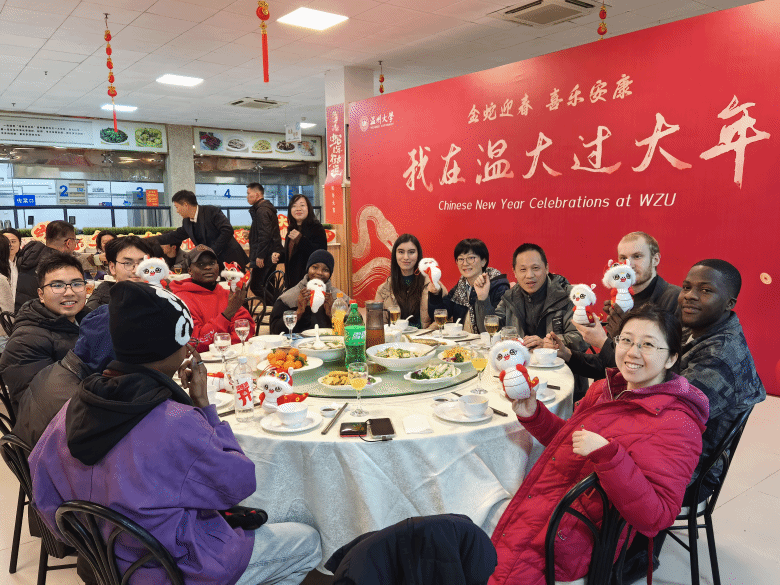当晚,温大怡口乐餐厅一楼装扮一新,张灯结彩、暖意融融。学校为寒假留校学生准备了丰盛的年夜饭,校党委副书记庄兴忠,副校长王舜,有关部门、学院负责人与留校师生欢聚一堂,共同迎接新春佳节的到来。留学生们在品尝美味的同时,也感受到了来自学校的温暖与关怀。王舜副校长与留学生亲切交谈,了解他们的学习情况,他希望留学生学好中文,来年再接再厉,学业蒸蒸日上。