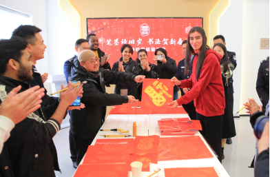 1月14日,国际教育学院与茶山派出所共同举办了以“笔墨辞旧岁,书法贺新春”为主题的特色活动。活动现场,墨香四溢。在专业书法老师的指导下,留学生们兴致勃勃地拿起毛笔,蘸满浓墨,一笔一划地书写着“福”字和春联。他们虽然初涉书法,但每个人都全神贯注,力求将每一个字都写得工整美观。写完后,他们还纷纷展示自己的作品,脸上洋溢着满足和喜悦的笑容。活动后来自乌兹别克斯坦的留学生娜美感慨的说:“春联上的每一个字都蕴含着吉祥和美好的寓意,这让我深刻体会到了中国人对和谐、好运的追求。这次体验让我更加热爱中国文化了。”