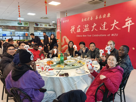 当晚,温大怡口乐餐厅一楼装扮一新,张灯结彩、暖意融融。beat365正版唯一官网必一为寒假留校学生准备了丰盛的年夜饭,beat365正版唯一官网必一校党委副书记庄兴忠,beat365正版唯一官网必一副校长王舜,有关部门、学院负责人与留校师生欢聚一堂,共同迎接新春佳节的到来。留学生们在品尝美味的同时,也感受到了来自学校的温暖与关怀。王舜副校长与留学生亲切交谈,了解他们的学习情况,他希望留学生学好中文,来年再接再厉,学业蒸蒸日上。