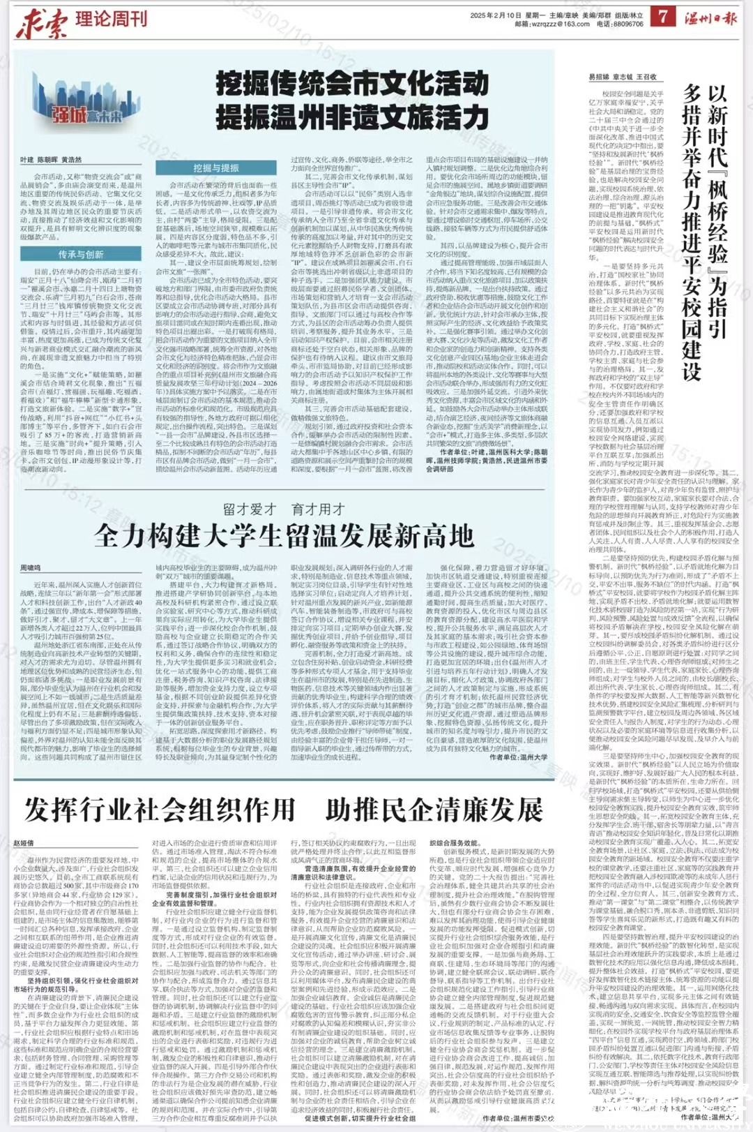 寒假期间,机电工程学院党建工作不停歇,持续送理论进基层,通过理论文章阐述、党建理论宣讲等多种形式助推地方基层党建工作发展。1月29日、2月10日,学院党委书记易招娣、学术副院长关震分别在《温州日报》理论版发表《以新时代“枫桥经验”为指引 多措并举奋力推进平安校园建设》《在守正创新中进一步全面深化改革》文章,同时学术副院长关震于2月19日在浙江省理论宣传平台之江策发表《“八八战略”指引浙江进一步全面深化改革》文章,主要论述了运用“枫桥经验”解决校园安全问题,实现校园系统治理、依法治理、综合治理、源头治理。“八八战略”指引浙江高质量发展,在守正创新中推动浙江进一步全面深化改革,并在这一过程中得以完善和发展。