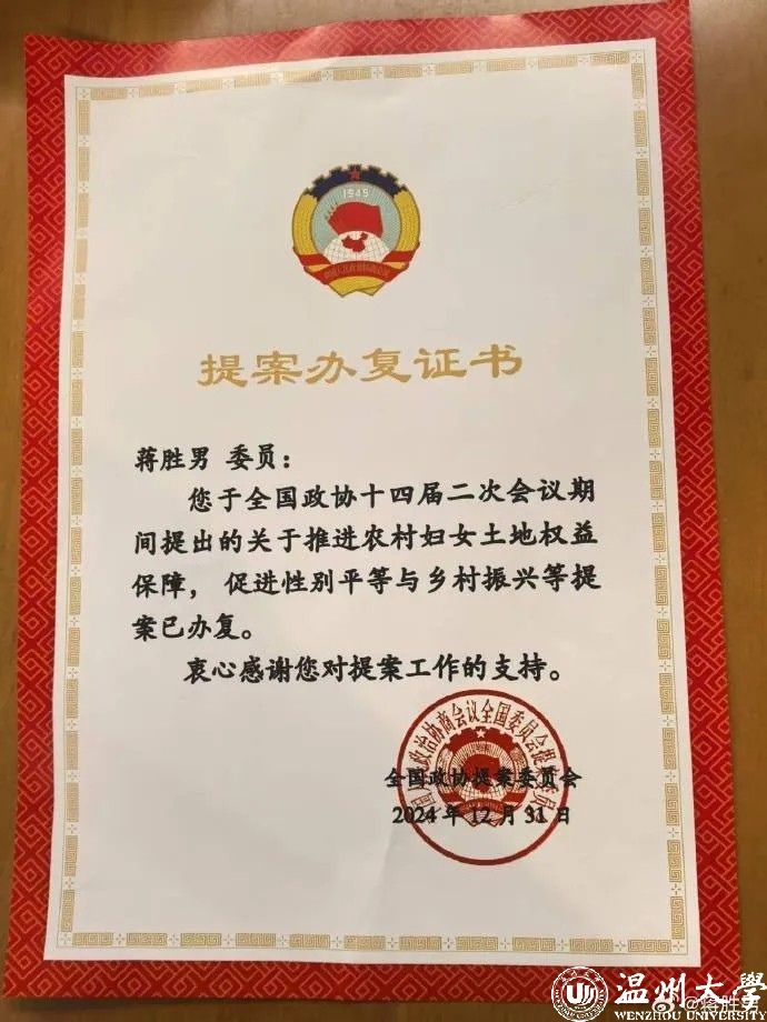 蒋胜男:去年年底,我收到了中国政协提案委下发的“提案办复证书”,我所提出的关于农村妇女权益的建议被写入法律当中。这是我第一次拿到办复证书。身为一名政协委员,看到提案得到落实、努力有了成果,我真的特别高兴。