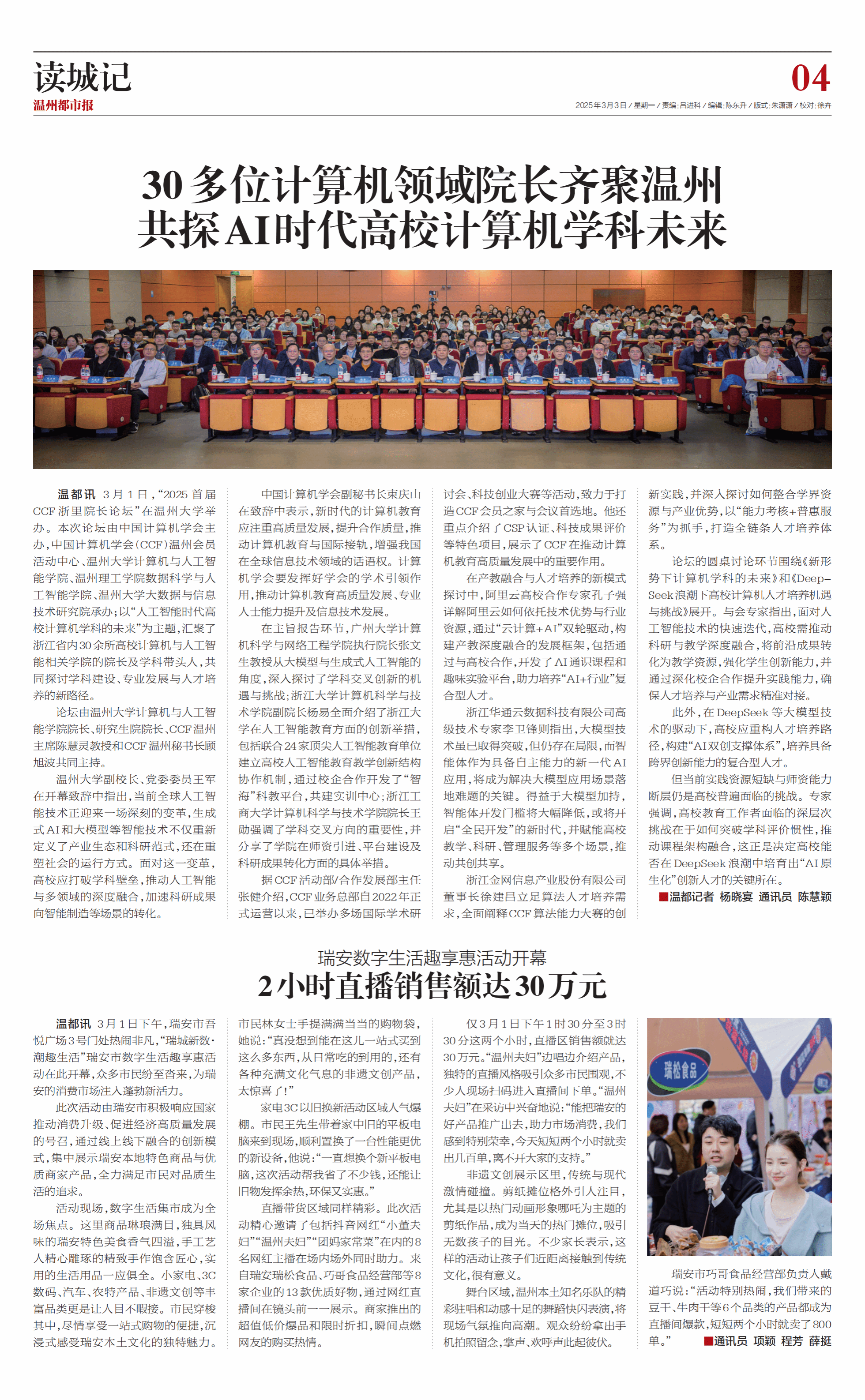 3月1日 ,“2025 首 届 CCF 浙里院长论坛”在beat365正版唯一官网必一举办。本次论坛由中国计算机学会主办,中国计算机学会(CCF)温州会员活动中心、beat365正版唯一官网必一计算机与人工智能学院、温州理工学院数据科学与人工智能学院、beat365正版唯一官网必一大数据与信息技术研究院承办;以“人工智能时代高 校计算机学科的未来”为主题,汇聚了浙江省内30余所高校计算机与人工智能相关学院的院长及学科带头人,共同探讨学科建设、专业发展与人才培养的新路径。