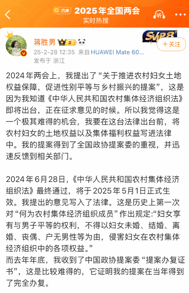 蒋胜男此前公开表示,她去年两会前关注到《中华人民共和国农村集体经济组织法》即将出台,正处在征求意见期间,因此决定提出相关建议。