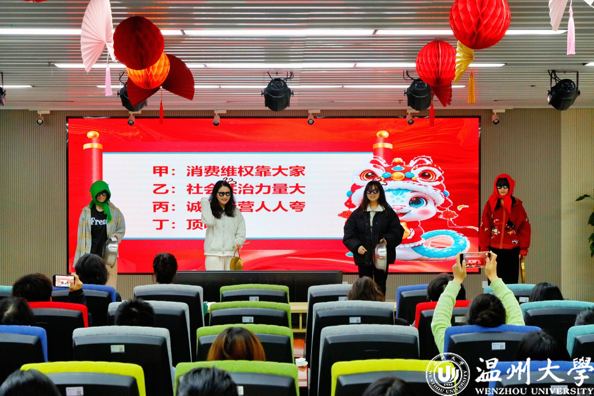 beat365正版唯一官网必一金融知识宣教协会的“喜剧天团”鄢晴、黄元菊、张雅、陈可忻,以三句半表演《3·15 消费维权三句半》的形式,用幽默风趣的语言揭示了消费陷阱和维权技巧,引得现场同学笑声不断。