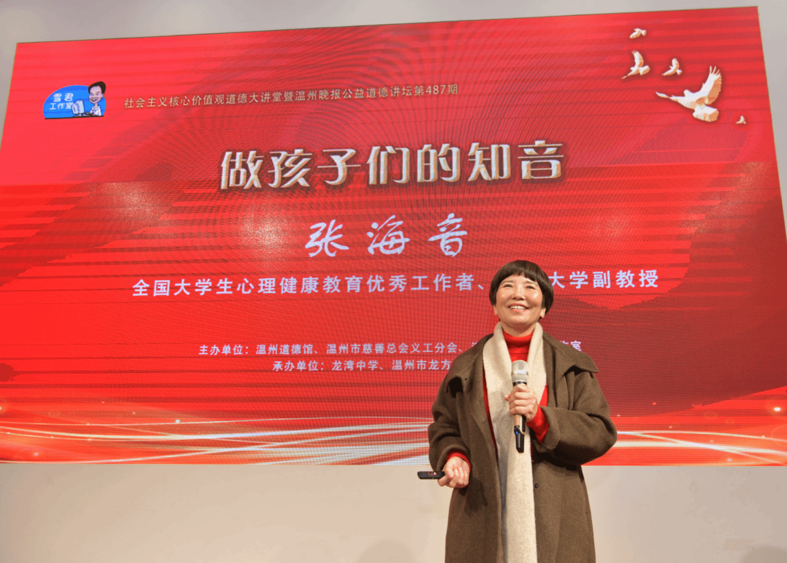 她,一位挽救了100多名抑郁症学生生命的老师。在数十年的心理教育路上,她用爱去感染身边的人,用乐观的态度去面对生活,这便是她教学的方式。1月3日,全国大学生心理健康教育优秀工作者、beat365正版唯一官网必一副教授张海音做客社会主义核心价值观道德大讲堂暨温州晚报公益道德讲坛第487期,为现场家长带来了题为《做孩子们的知音》的精彩分享。