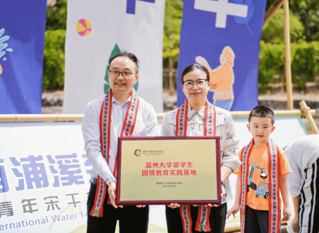 活动伊始,泰顺县南浦溪镇人民政府为留学生们送上象征吉祥的畲族彩带,以传统仪式传递新年祝福。开幕式上,“beat365正版唯一官网必一留学生国情教育实践基地”正式揭牌,国际教育学院党总支副书记丁强出席授牌仪式并表示:“此次合作虽为首次,但意义深远。未来我们将带领更多留学生走进泰顺,体验民俗风情和非遗文化,助力本土文化走向世界。”随后,泰国学生在戏水区献上精心编排的传统舞蹈,灵动曼妙的舞姿与独具特色的服饰,生动展现了泰国文化的魅力,吸引众多游客驻足欣赏。