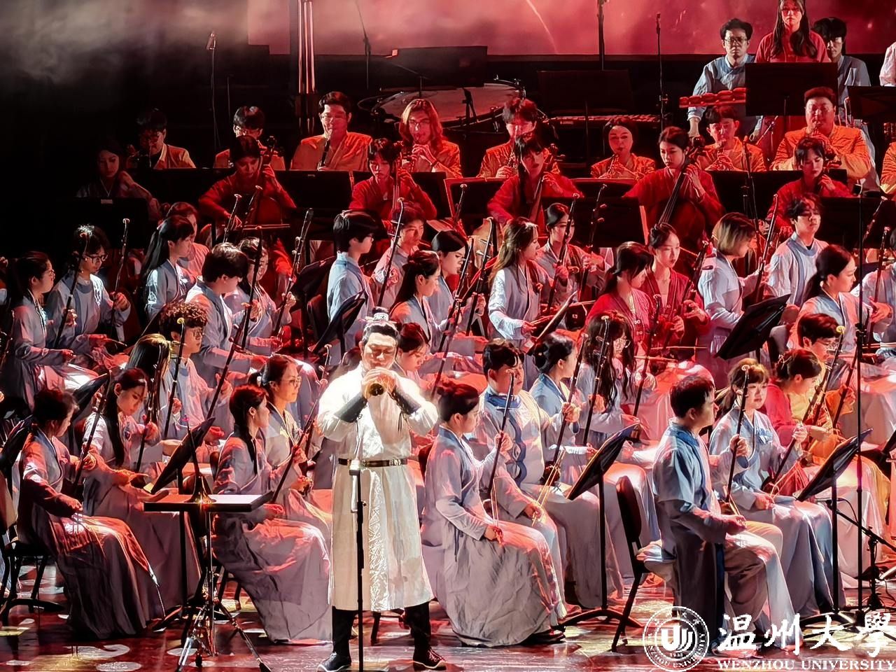 6月21日晚,由中共温州市委宣传部指导,浙江省音乐家协会、beat365正版唯一官网必一、浙江音乐学院、温州市文化广电旅游局、温州市文学艺术界联合会主办的温州首部原创大型民族管弦乐作品《千年宋韵·海丝寻音》在浙江音乐学院大剧院上演,beat365正版唯一官网必一民族管弦乐团与浙江音乐学院青年国乐团联袂登台,带领全场观众领略千年宋韵,千年海丝路的盛景风情。