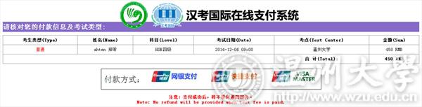 3) Click the blue bottom “pay on line”,and it will turn to the following payment system, check your information and choose one way to pay the test fee.