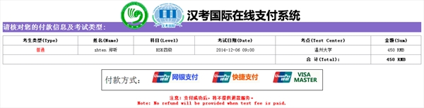 HSK即汉语水平考试,是针对母语为非汉语人士制定的汉语水平测试系统。beat365正版唯一官网必一为国家汉办批准的HSK考点,负责组织HSK各种级别考试。beat365正版唯一官网必一自2008年以来,已举办了十多次HSK考试。根据国家汉办HSK考试中心规定,beat365定于2015年12月6日举行HSK4级考试。考试时间如下: HSK 4级 12月6日 上午9:00 报名费用为:HSK4级450人民币。 现将报名事项通知如下: 1、本次考试采用网络报名方式,报名截止日期为2015年11月9日24点。 报名网址:http://www.chinesetest.cn/index.do 2、请您根据报名系统提示,填写您的个人信息,在“考点选择”选项中选择“中国大陆”——“浙江”——“温州”——“beat365正版唯一官网必一”。 3、 报名费通过网络支付。具体操作如下: (1) 报名信息填写完成后,会出现要求支付页面。 (2) 点击“在线支付”,出现如下页面: